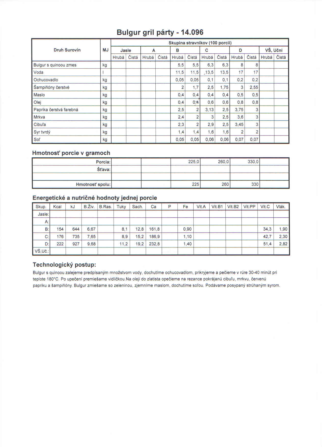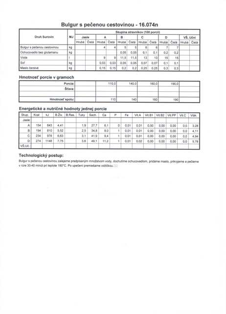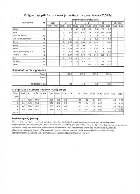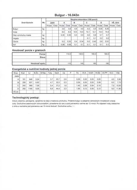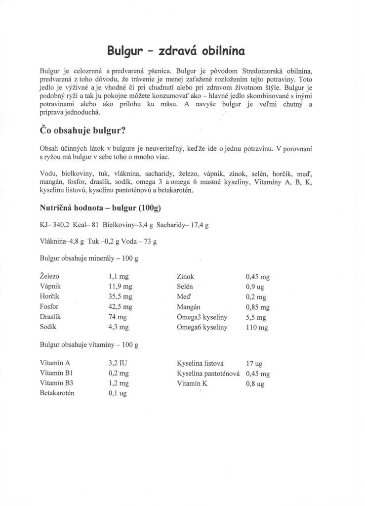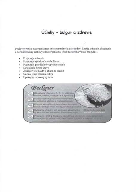 pre niekoho známa zdravá potravina, pre iného veľká neznáma. Predpokladám, že väčšina z vás o tejto potravine síce niečo počula, ale veľa toho o nej nevie. Možno sa pýtate ako ten „záhadný bulgur“ môžem konzumovať? Ako prílohu k bežnému jedlu. Nahrádza najmä ryžu a zemiaky. Je vhodný skoro ku každému mäsu. Okrem toho môže byť súčasťou šalátov, jednak ovocných, ako aj zeleninových. Stretnúť sa s ním môžeme v polievkach, vo fašírkach, ako aj v ďalších jedlách.Bulgur našiel svoje miesto a obľubu u stravníkov aj v našej jedálni.Najobľúbenejšie pokrmy z bulguru, ktoré zaraďujeme do jedálneho lístka