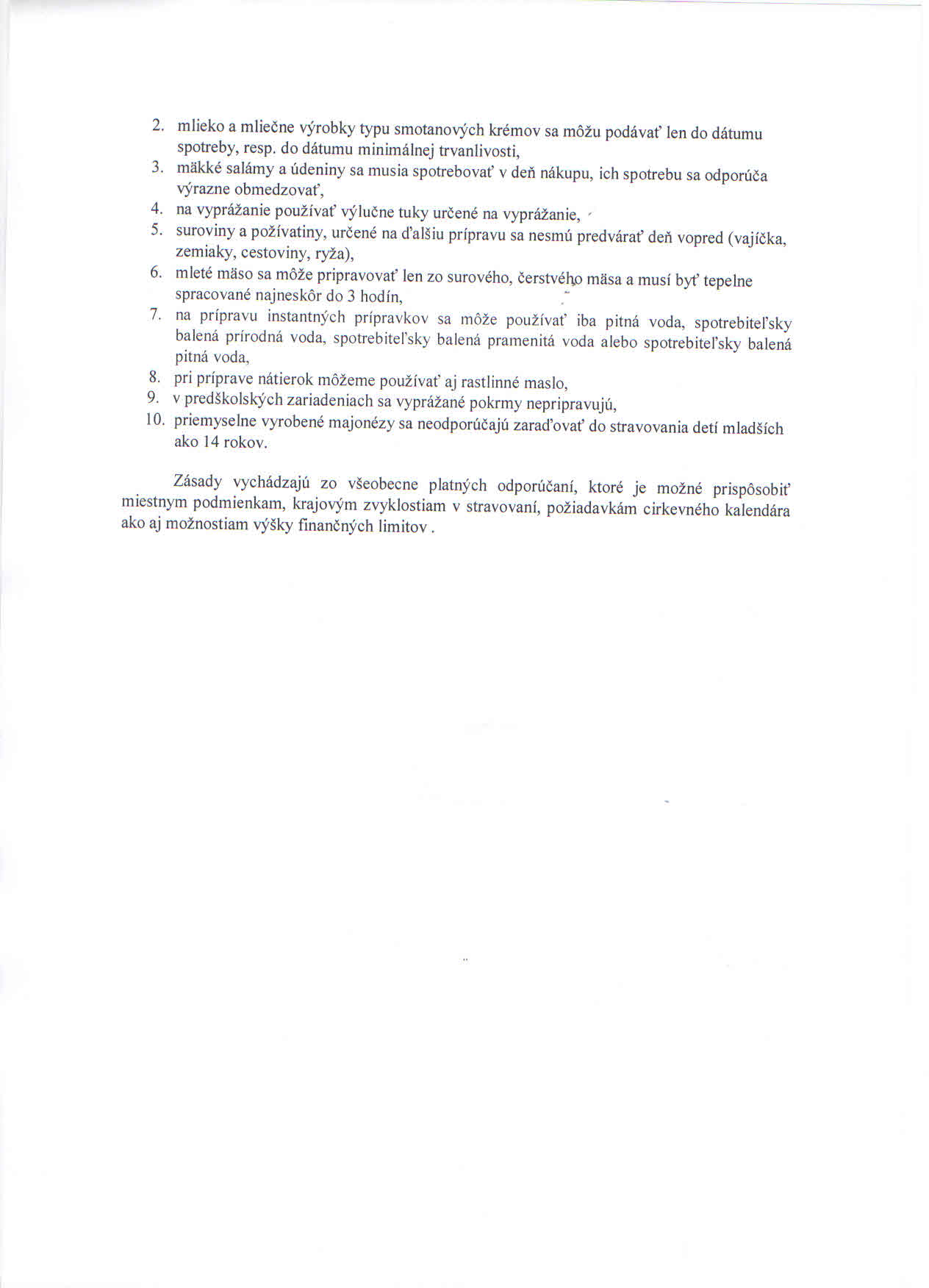 - nátierky spracovať zásadne z čerstvých surovín- mlieko a mliečne výrobky podávať len do dátumu spotreby- mäkké salámy a údeniny výrazne obmedzovať, resp. vôbec nepoužívať- na vyprážanie používať tuky na to určené- mleté mäso pripravovať len zo surového čerstvého mäsa a ihneď tepelne spracovať- v MŠ vyprážané pokrmy nepoužívaťVšetky zásady vychádzajú zo všeobecne platných odporúčaní, ktoré je možné prispôsobiť miestnym podmienkam, krajovým zvyklostiam v stravovaní, požiadavkám cirkevného kalendára ako aj možnostiam výšky finančných limitov.