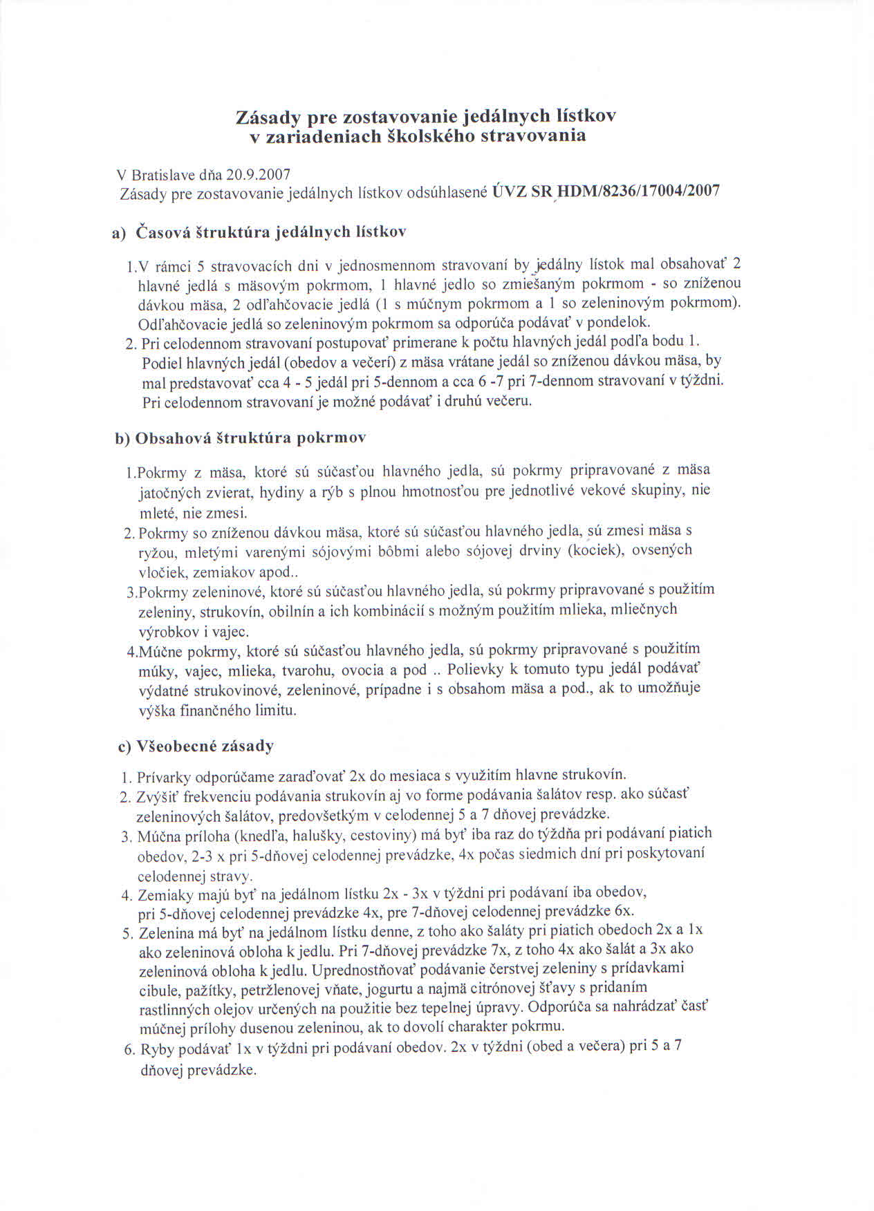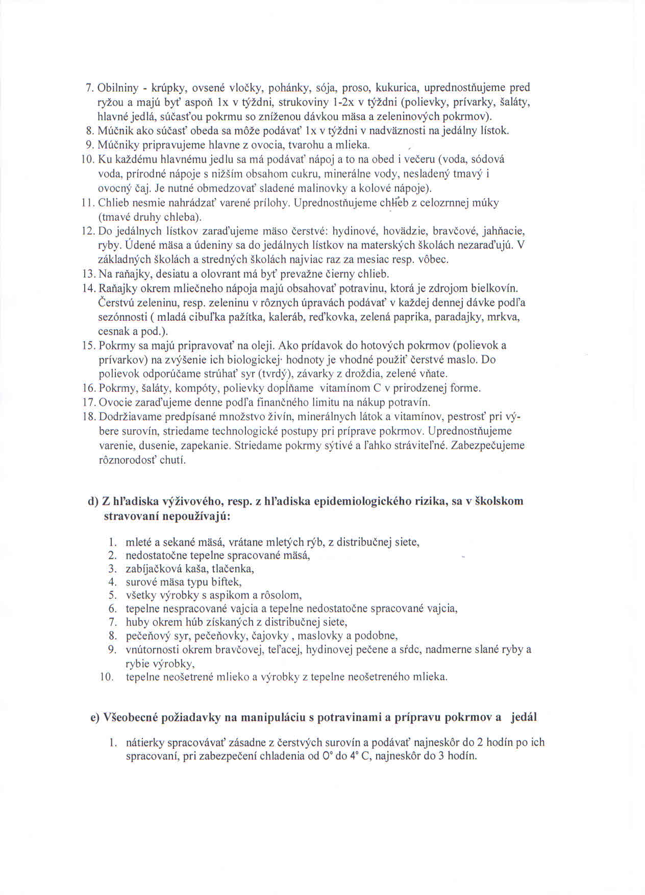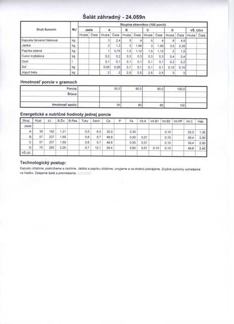 Všeobecne Jedálny lístok sa zostavuje na týždne aj mesiac dopredu na základe Materiálno-spotrebných noriem a receptúr pre školské stravovanie vydaných MŠ a MZ SR pri dodržiavaní Metodických pokynov pre oblasť školského stravovania vydaných MŠ SR a článku: Zásady pre zostavovanie jedálnych lístkov v zariadeniach školského stravovania. Na základe zásad pre zostavovanie jedálnych lístkov sa dodržiava:a) časová štruktúra jedálnych lístkov (2 hl. jedlá z mäsa, 1 hl. jedlo polomäsité, 1hl. jedlo lakto-ovo-vegetariánske, 1 hl. jedlo múčne)b) obsahová štruktúra jedálnych lístkov (obsah časti a))c) všeobecné zásady (prívarky raz týždenne s využitím najmä strukovín, zemiaky 2-3 x v týždni, zelenina denne, ryby 2x v mesiaci, strukoviny 2-3x v týždni, múčne prílohy 1x v týždni, múčnik(tyčinka) ako doplnok vrátane pudingu alebo jogurtu za zemiak. pokrmom, na desiatu a olovrant podávať tmavý chlieb, grahamové a sójové pečivo, striedanie technologickej prípravy pokrmov Všetky jedlá pripravované v školskej jedálni sú určené pre školské stravovanie. Odborníci pri zostavaní noriem dbajú o zdravie detí, nakoľko je vedecky dokázané, že všetky choroby, ktoré človeka ovládajú pochádzajú z jedla, ich počiatok je v tráviacom a zažívacom trakte a pri nesprávnom stravovaní je len otázkou času, kedy choroba prepukne. Odborníci apelujú na rodičov, aby dôverovali školskému stravovaniu, chcú pre ich deti len to najlepšie. Taktiež apelujú na pedagógov, aby od útleho veku (MŠ) viedli deti v duchu nielen správneho stolovania a používania príbora pri obede, ale hlavne na základe svojich vedomostí získaných štúdiom, využívali a používali v praxi pri vedení žiakov k správnej životospráve a zdravého životného štýlu.