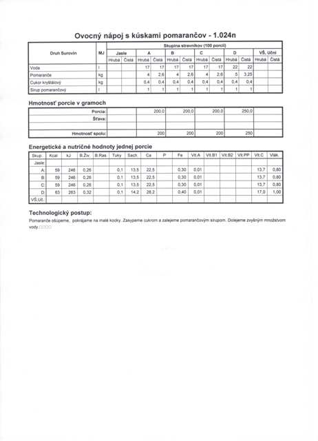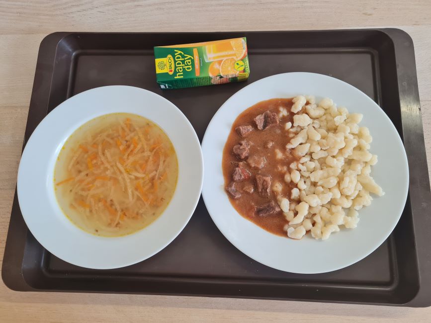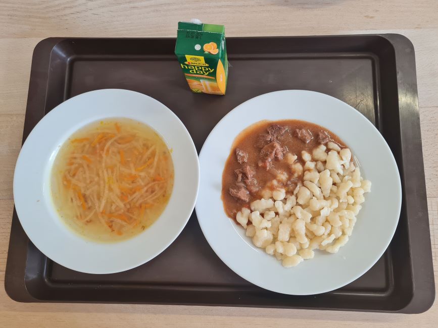 1. stupeň a 2.stupeňPolievka: Kalerábová 200g/220gZávarka: Pohánka 12g/12gObed: Hovädzí guláš maďarský /mäso + šťava/ 40g + 80g / 46g + 90gPríloha: Halušky 160g/180gNápoj: Džús krabička 200g/2001.stupeň: krabička džúsu postavená2.stupeň: krabička džúsu leží:-)