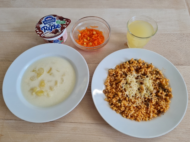 1.stupeňPolievka: Kyslá zemiaková s vajíčkom 200gObed: Cuketa a šampiňóny na paradajkách s tarhoňou 215g Šalát mrkvový s medom a kukuricou 55g Voda s citrónovou šťavou 200 g Ryžová kaša s čokoládou /hotový výrobok/ 175 g