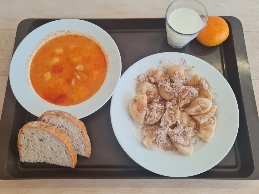 2 stupeňPolievka: Rybacia s lečom a zemiakmi 220gChlieb k polievke 50gObed: Pirohy plnené ovocnou náplňou/hlboko zmrazené/ 240gPosýpka: Škoricová na cestoviny 40gMlieko 200gMandarínka