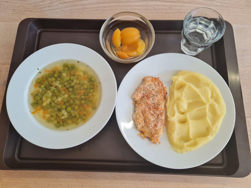 1.stupeňPolievka: Zo zeleného mrazeného hrášku 200 gZávarka: Mrvenička 25 gObed: Kuracie prsia v jogurte 90 gZemiakové pyré 195 gStolová voda 200 gKompót marhuľový s nálevom 130 g