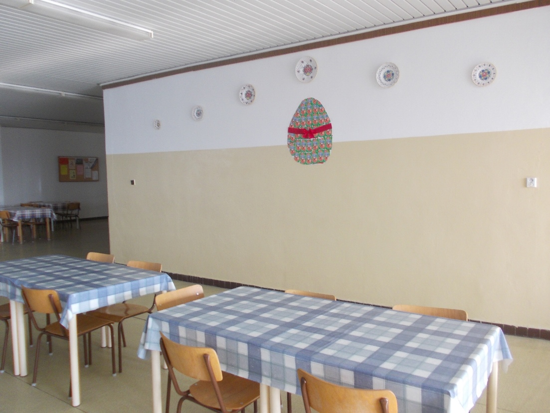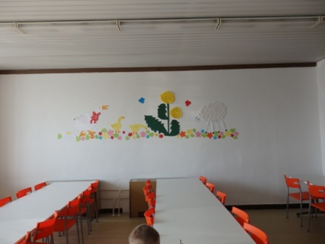 Blížia sa sviatky jari a naša jedáleň „rozkvitla“ a rozžiarila sa výzdobou. Prišli nás navštíviť sliepočky, húsky, ovečka, zajačiky a prázdna biela stena rozkvitla pod farebnými kvietkami. Symbol Veľkej noci je vajíčko a korbáč a našu stenu zdobí „obrovské“ vajce. Na ten korbáč si počkáme, azda si niektorý stravník spomenie, že na škole sú aj kuchárky, ktoré treba „vyšibať“:-))Za výzdobu veľmi pekne ďakujeme šikovným rukám našich vychovávateliek – Adriáne a Marike.vedúca jedálne