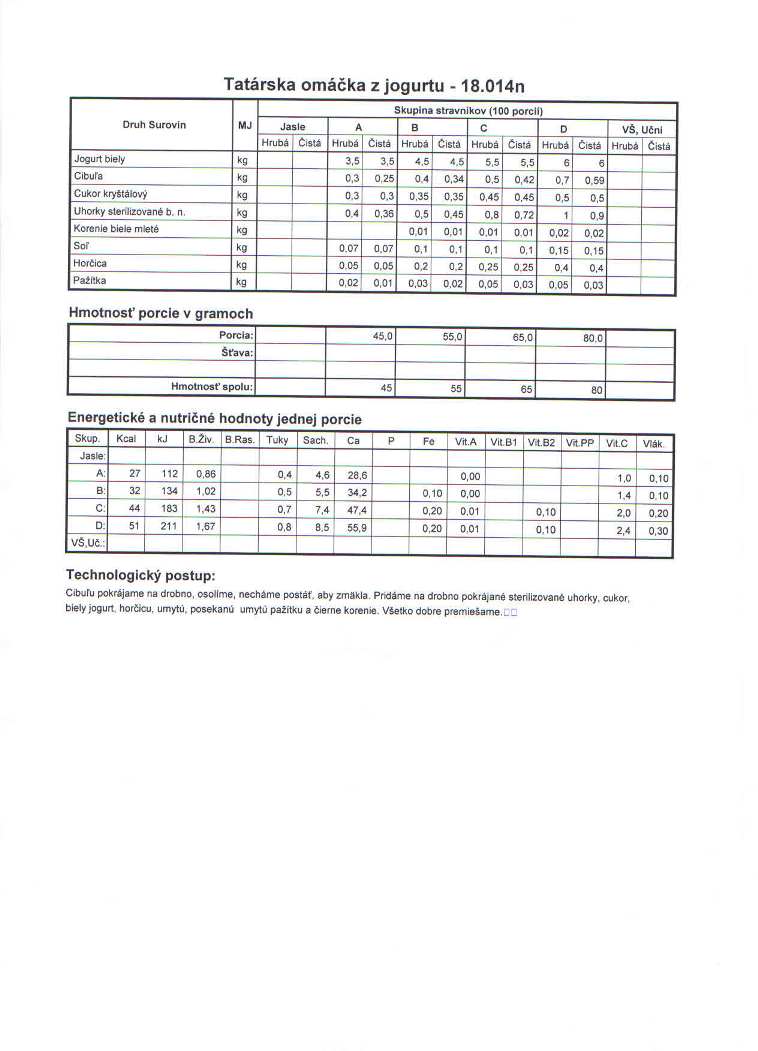 Na základe viacerých dotazov od rodičov uverejňujem našu normu na prípravu tatárskej omáčky z jogurtu. Týmto chcem ubezpečiť rodičov, že majolku prí príprave tatárskej omáčky nepoužívame.Naša "tatarka" je zdravá a deťom chutí.vedúca jedálne
