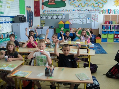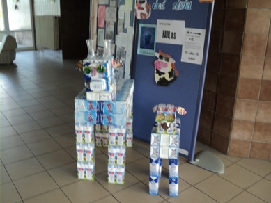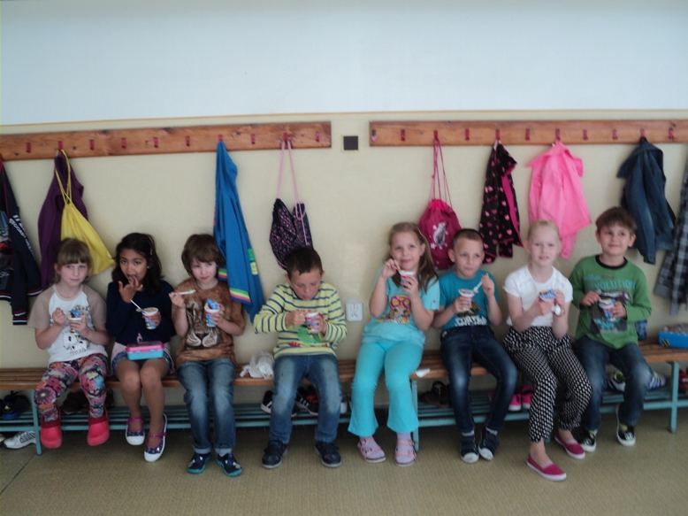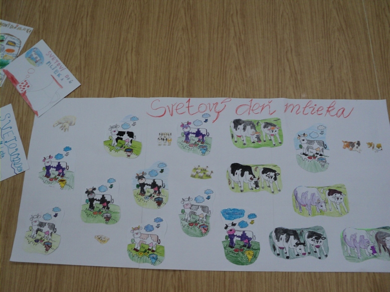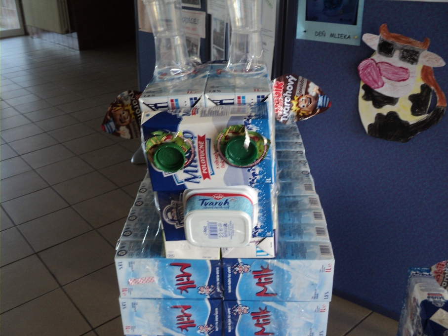 "Mliečko, mliečko, to je veda,bez neho sa vyrásť nedá.Bez neho vraj budem malý,nebudem mať žiadne svaly"v tomto duchu sa niesol celý deň na našej škole. Ráno žiakov vo vestibule vítala kravička s teliatkom, vyrobená z druhotných surovín - z krabíc mlieka. V niektorých triedach i v oddeleniach ŠKD žiaci vytvárali projekty, kde využili rôzne obalové materiály z mliečnych výrobkov. Na desiatu všetci žiaci školy dostali ovocný jogurt, aby sa tohto dňa zúčastnili nielen činnosťou, ale aj konzumáciou mliečneho výrobku. Sponzorsky dodalo - RAJO, a.s. Bratislava. Jedáleň stravníkov vítala vyzdobená k danej téme, tiež ich vítala pani vedúca s milou čiapkou kravičky na hlave a spoločne sme si pripili čistým mliekom. Verím, že deň sa dostal do povedomia detí ako deň plný "bieleho" zdravia. Ďakujem sponzorovi a tiež šikovným našim pani vychovávateľkám, ktoré mi pri organizácii akcii boli veľmi nápomocné. vedúca jedálne