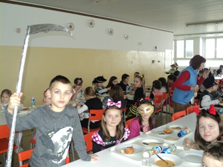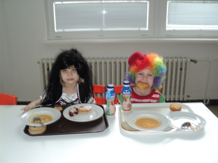 Obdobie od Troch kráľov do Popolcovej stredy nazývame fašiangy. Fašiangy sú prechodom medzi zimným a jarným obdobím. Počas fašiangov prevláda zábava, plesy, karneval a masky. Jedným slovom - svet počas fašiangov je "hore nohami"Práve dnes do našej jedálne zavítali "masky" v podobe našich malých stravníkov. Jedáleň sa stala promenádou princezien, čertíc, šašov, Zorov, rôznych bojovníkov, Samozrejme všetko milé masky na tváričkách detí. Prichádzali po skupinách, každá skupina zaspievala fašiangovú pieseň. Pani kuchárky im pripravili typické fašiangové jedlo - šišky s džemom. Z jedálne odchádzali s plnými bruškami, rozihrané a pripravené na karneval, ktorý ich čaká v školskom klube. Bol to deň a obed taký iný - fašiangový.vedúca jedálne