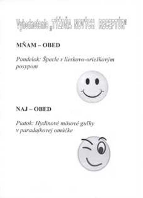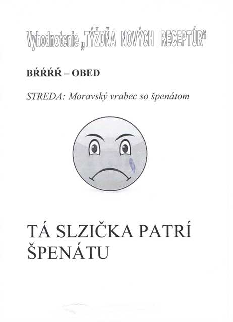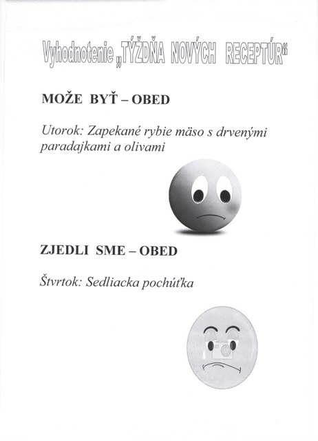 „Týždeň nových receptúr“ máme úspešne za sebou. Ku každému dňu som pripravila informácie k jedlu, foto-dokumentáciu a stravníci sa mohli na anketových lístkoch vyjadriť k pokrmu, čo sme práve v ten deň varili. Svoju úlohu zobrali so všetkou vážnosťou, predbiehali sa, kto čo napíše a u kamarátov sa uisťovali, či ten ich názor je už na lístku. Boli veľmi milí a s pani kuchárkami sme sa pri vyhodnocovaní aj trošku zamysleli, aj trošku pobavili. Niektoré názory z lístkov: „ Dievčatá! – stop špenátu., „Môže byť, ale len raz“ „Túto grcku už nie“, „špecle boli feckové“, „Dnes to bolo mňamkové“, „áno, áno, jesssss!“Takže v praxi sme si overili, čo si naši stravníci myslia o obedoch. Boli rôzne kombinácie, rôzne názory a na základe nich som smajlíkmi vyhodnotila tento týždeň, tak ako ho hodnotili Vaše deti. Vedúca jedálne