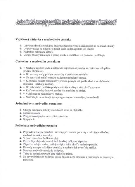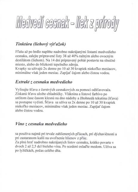 Medvedí cesnak je vhodný pre každého, je totiž oveľa lepšie stráviteľný ako cesnak. Konzumujeme jeho listy, cibuľka je tiež jedlá, avšak nechutí tak dobre, ako v prípade cesnaku kuchynského. Preto je lepšie trhať iba listy a cibuľku ušetriť, nech rastlinka rastie aj budúci rok. Rastlina je veľmi účinná a pomáha pri najrôznejších neduhoch.Znižuje krvný tlak, zmierňuje žalúdočné problémy, pomáha pri kŕčových žilách aj v boji s cholesterolom, čistí cievy. Odporúčam ju podávať aj pri zápchach a hnačke, neznášajú ho rôzne črevné parazity, ako škrkavky a hlísty. Medvedí cesnak je tiež prírodné antibiotikum.
