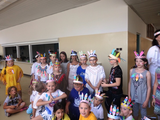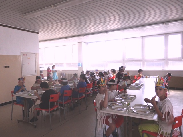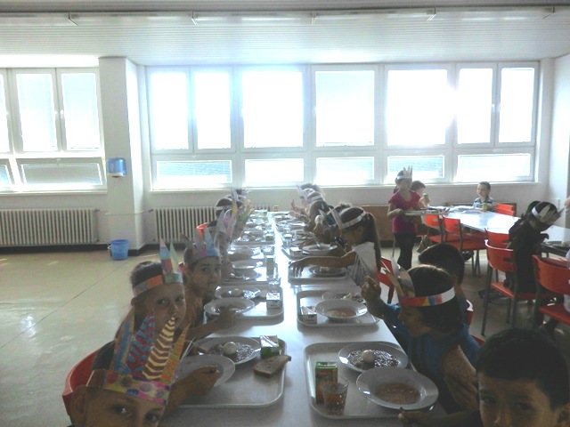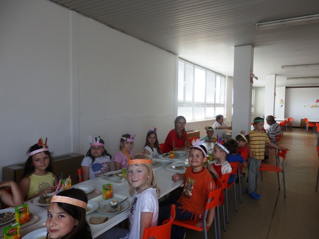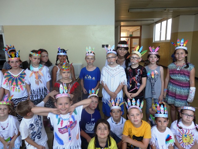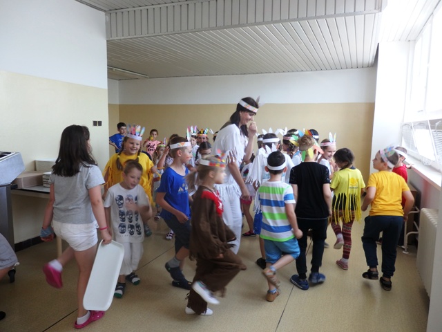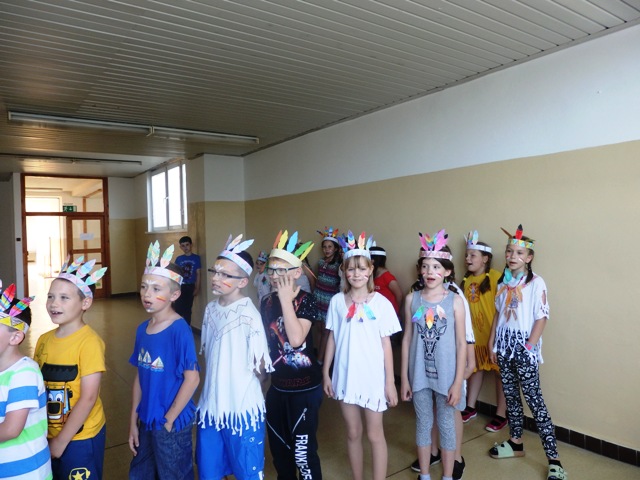 našu jedáleň v piatok na obed "prepadli" hladní indiáni. Nezľakli sme sa, lebo to boli naši družinári preoblečení za Indiánov. Prišli Siuxovia, Apači, Huróni, Huga-mabovia s pokrikom, indiánskymi piesňami i indiánskym tancom. Náš indiánsky obed - šošovica- po indiánskych výkonoch im chutil. Milé spestrenie na konci školského roka. Ďakujeme.