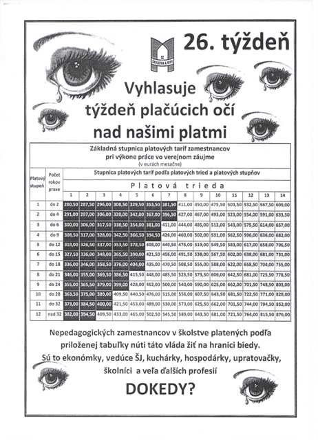 Deti sa pri obede pýtajú, či niekto zomrel, keď pani kuchárky sú v čiernom. Nezomrel. Naša škola- kuchárky, upratovačky, školník, ekonómka, niektorí pedagogickí pracovníci sme šli do čierneho, aby sme podporili kampaň pod názvom " Týždeň plačúcich očí nad našimi platmi".Zmena našich platových tabuliek je naozaj potrebná. Chceme veriť, že takýto "čierny" protest prinesie aj výsledok.vedúca jedálne