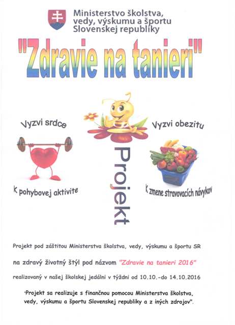 Naša školská jedáleň sa úspešne zapojila do projektu na podporu zdravia a zdravého životného štýlu pod názvom „ZDRAVIE NA TANIERI“. Realizácia projektu: druhý októbrový týždeň A/ „ZMEŇ OBEZITU STRAVOVACÍMI NÁVYKMI“Počas celého týždňa v jedálni bude stôl, kde budeme vystavovať čerstvú zeleninu s popisom a jej významom v strave detí. Následne z tohto druhu zeleniny pripravíme šaláty, ktoré deti budú konzumovať pri obede. Urobíme viac druhov šalátov, dieťa sa samo rozhodne aký šalát si vyberie. K tomuto účelu sme zakúpili šalátový pult, z ktorého samoobslužne si dieťa bude vyberať.B/ „VYZVI SRDCE POHYBOVOU AKTIVITOU“V rámci tohto týždňa deti v družine budú „zumbovať“a starší žiaci „švihadlovať“C/ VZDELÁVACIA AKTIVITAV spolupráci so školským klubom urobíme besedu s odborníčkou na zdravú výživu. Cieľom projektu je motivovať stravníkov zmeniť stereotypné stravovacie návyky v konzumácii zeleniny a šalátov z nej. Tešíme sa na realizáciu a veríme, že i stravníkov poteší možnosť výberu z viac druhov šalátov nielen počas tohto týždňa, ale počas celého školského roka.Spoločne dajme "zelenú" zelenine a šalátovému pultu.vedúca jedálne