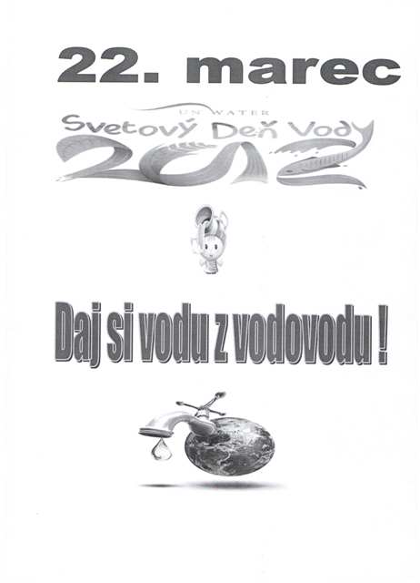 Valné zhromaždenie OSN schválilo na svojom 47. zasadnutí v decembri 1992 v Rio de Janeiro rezolúciu, ktorá 22. marec vyhlásila za Svetový deň vody. Od roku 1993 si ho pripomíname každoročne u nás i na celom svete.Aj v našej jedálni si pripomenieme tento deň pod názvom "DAJ si vodu z vodovodu". Predchádza tomu príprava žiakov, ktorí maľujú, tvoria básne , rôzne dekorácie na tému "VODA". Všetky práce a dekorácie sú vystavené v jedálni. Vypísali sme súťaž o najkrajšiu báseň o vode. V tento deň bude počas obeda bohatý pitný režim vody, vody ochutenej ovocím a bylinkami. Odmeníme všetkých a pre víťaza, alebo víťazný kolektív pani kuchárky pripravia malé prekvapenie. vedúca jedálne