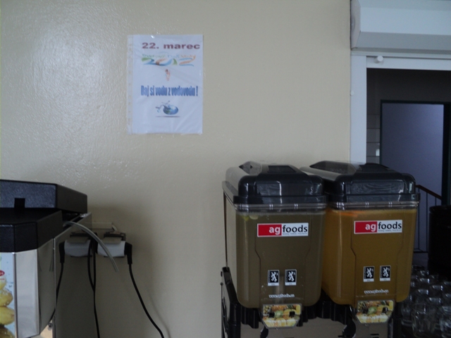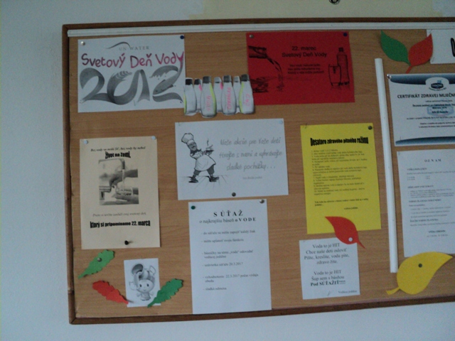 Deti celý deň v škole si pripomínali tento deň rôznymi činnosťami a do jedálne prichádzali s papierovými medailami v tvare kvapky vody. Pani učiteľky boli veľmi kreatívne a hravou formou ich vtiahli do "sveta vody". Do tejto aktivity sa pripojila aj naša jedáleň a stravníkom sme pripravili za obedom čistú vodu a vodu ochutenú limetkou a mätou. Taktiež nástenka bola upravená k tomuto dňu. Takže náš "vodný pitný režim" bol malou a chutnou bodkou venovanou tomuto dňu.vedúca jedálne