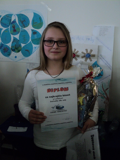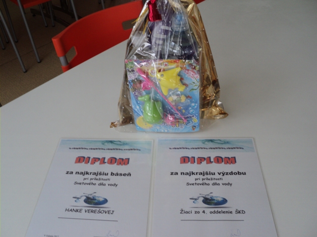 V dnešný deň sme zúročili všetku snahu a iniciatívu, ktorú deti, pani vychovávateľky i pani kuchárky venovali propagácii ku Svetovému dňu vody. Pani vedúca všetkým deťom poďakovala za práce a ocenila ich vedomosti a znalosti o vode ako takej.V y h o d n o t e n i e : Diplom a malé sladké prekvapenie od pani kuchárok.Najkrajšia báseň: Hanka Verešová, 4A triedaMalá bezmocná dažďová kvapkaa mokrá je celá čiapka.Jedna malá slzičkaa už zmení farbu líčkaAk uvidíš kvapku rosyskús prejsť cez ňu bosí.Je studená a mokrá však,neskúsil by to ani snehuliakNajkrajšia výzdoba, práca: žiaci zo 4.oddielu ŠKD pod vedením pani vychovávateľky Špitalskej, ktorí vytvorili veľmi peknú koláž s témou vody. Víťazom blahoželáme. "Voda to je kamarát, preto ju má každý rád."vedúca jedálne