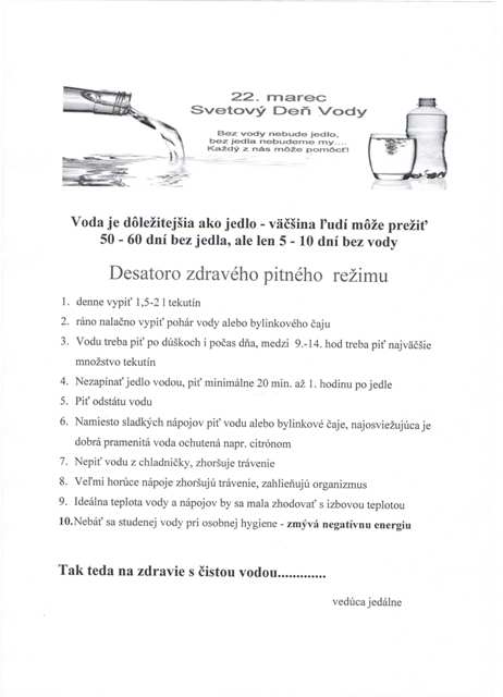 Voda je dôležitejšia ako jedlo - väčšina ľudí môže prežiť 50 - 60 dní bez jedla, ale len 5 - 10 dní bez vodyDesatoro zdravého pitného režimu1. denne vypiť 1,5-2 l tekutín2. ráno nalačno vypiť pohár vody alebo bylinkového čaju3. Vodu treba piť po dúškoch i počas dňa, medzi 9.-14. hod treba piť najväčšie množstvo tekutín4. Nezapínať jedlo vodou, piť minimálne 20 min. až 1. hodinu po jedle5. Piť odstátu vodu6. Namiesto sladkých nápojov piť vodu alebo bylinkové čaje, najosviežujúca je dobrá pramenitá voda ochutená napr. citrónom7. Nepiť vodu z chladničky, zhoršuje trávenie8. Veľmi horúce nápoje zhoršujú trávenie, zahlieňujú organizmus9. Ideálna teplota vody a nápojov by sa mala zhodovať s izbovou teplotou10. Nebáť sa studenej vody pri osobnej hygiene - zmývá negatívnu energiuTak teda na zdravie s čistou vodou v tento deň aj v našej jedálni... vedúca jedálne